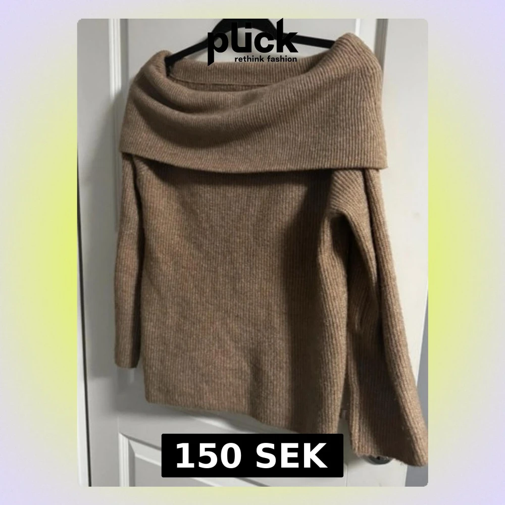 Säljer en beige stickad tröja med offshoulder-krage. Tröjan har långärmade och är ribbad och stickad. Tröjan är i storlek S men är lite oversized.