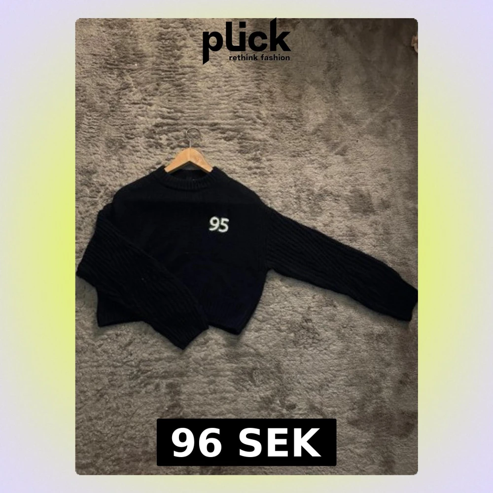 Mysig mörkblå stickad tröja med broderad siffra '95' i vitt på bröstet. Tröjan har grovstickade ärmar, ribbad halsringning och muddar. Perfekt för dig som gillar en enkel men cool look.