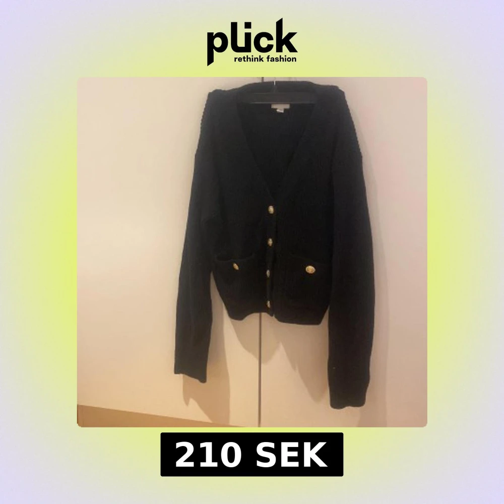 Svart stickad kofta från H&M i storlek S. Koftan har snygga guldknappar framtill och två fickor. Den är ribbstickad och har en klassisk v-ringning samt långa ärmar. Perfekt att slänga på sig när det är kyligt ute.