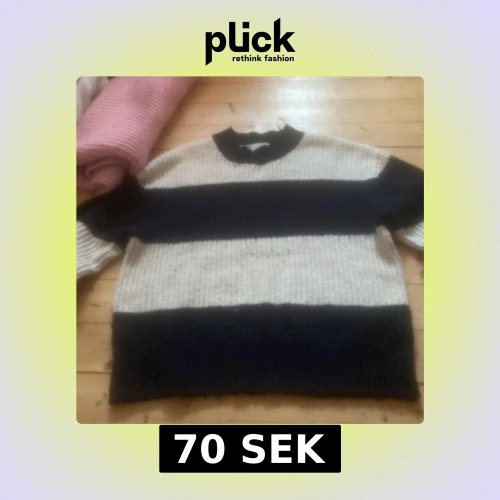 Säljer en mysig stickad tröja från H&M i svart och beige med breda ränder. Tröjan har långa ärmar och en klassisk passform, perfekt för kyligare dagar.
