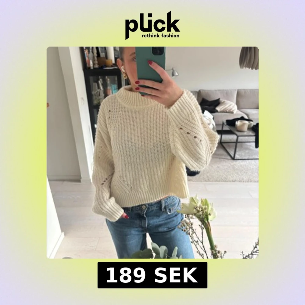 Säljer en krämvit stickad tröja från H&M i storlek S. Tröjan har en chunky ribbad struktur, hög hals och är lite croppad i modellen. Långa ärmar med snygga håldetaljer längs axlarna och sidorna. Perfekt för att få en chill och trendig look.