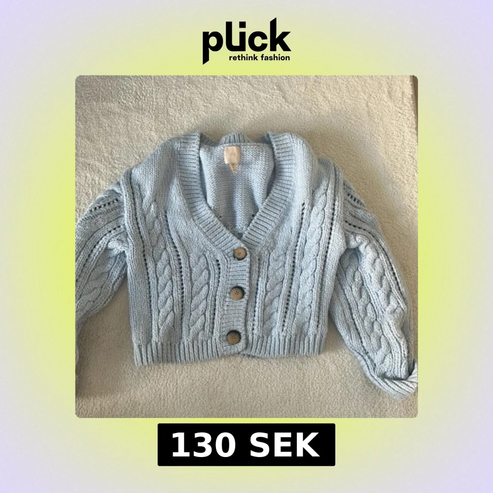 Säljer en mysig ljusblå stickad kofta med flätstickat mönster och tre stora knappar framtill. Perfekt för kyliga dagar och ger en stilren look. Passar bra till både jeans och kjol.