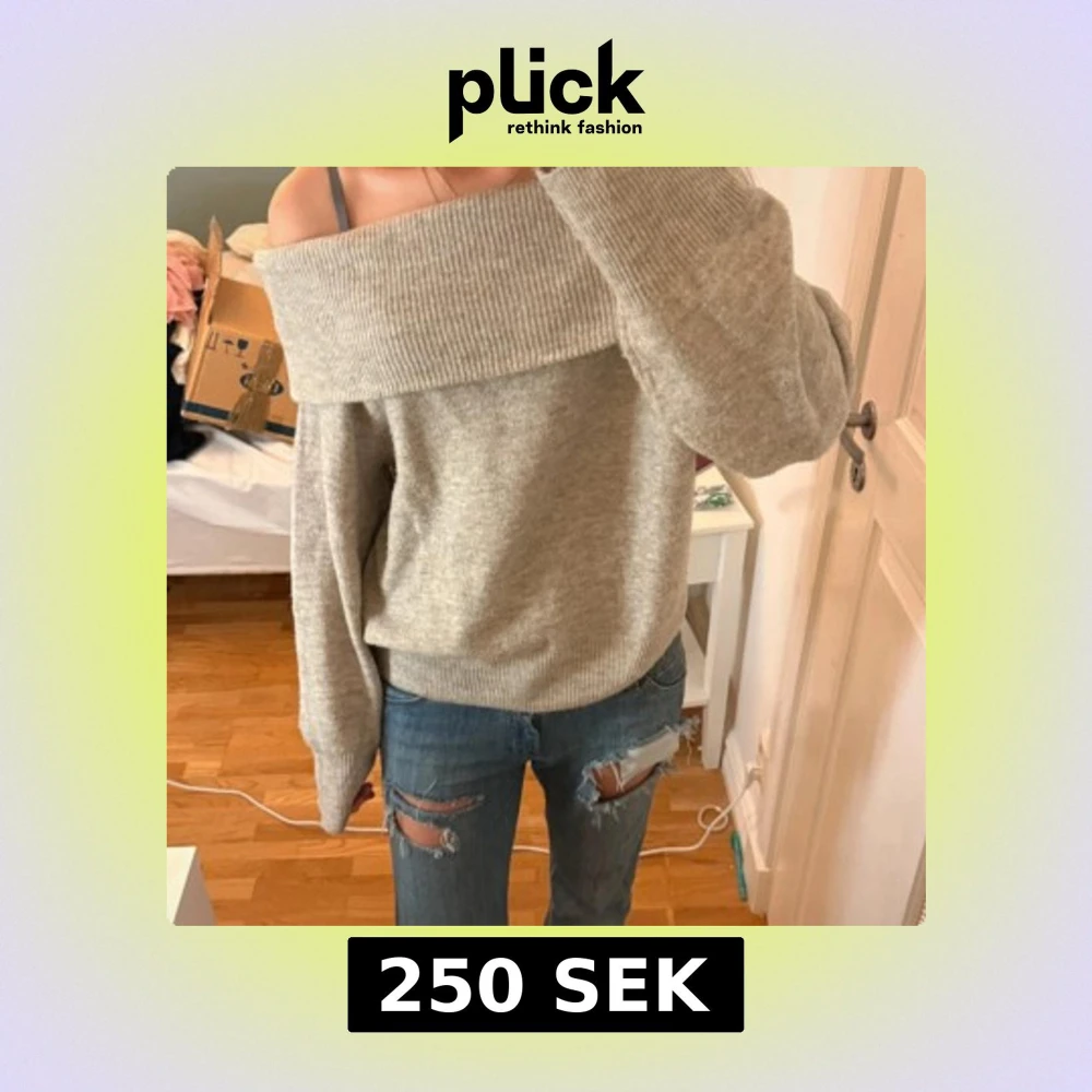 Supermysig grå stickad tröja med bred ribbad offshoulder-krage. Tröjan har lång ärm och en loose fit som ger en chill vibe. Perfekt att styla med jeans för en avslappnad look.