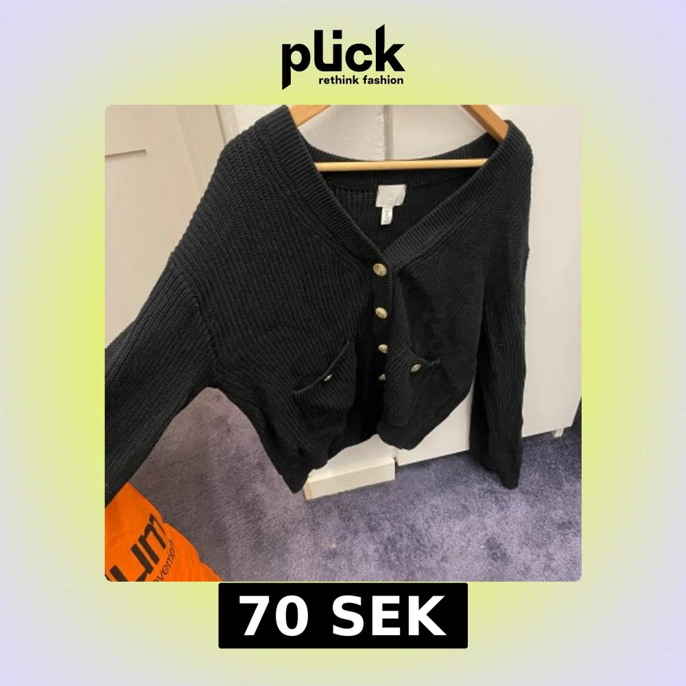 Svart stickad kofta från H&M i storlek S. Koftan har snygga guldknappar framtill och två fickor med dekorativa knappar. Modellen är v-ringad och har långa ärmar. Perfekt för dig som gillar klassisk stil med en twist.