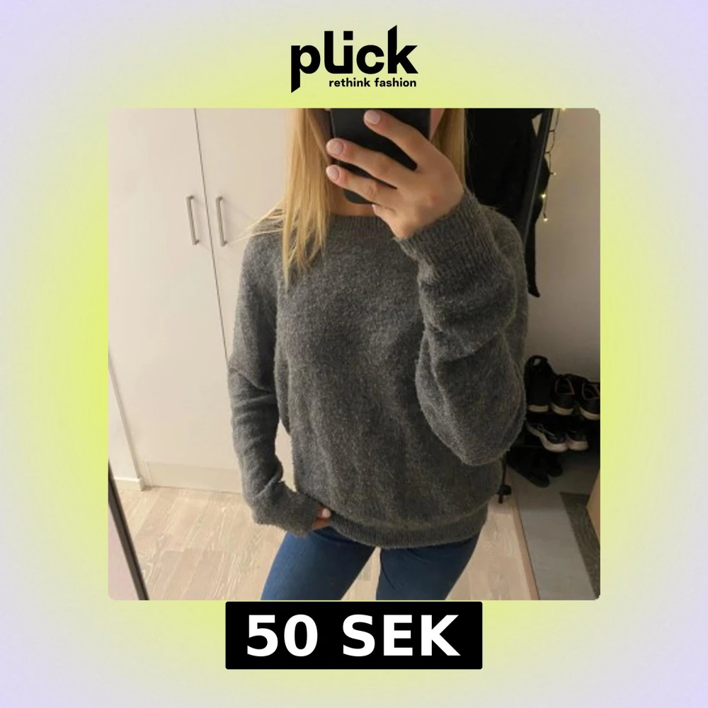 Mysig grå stickad tröja med långa ärmar och ribbade muddar. Perfekt för kyliga dagar.