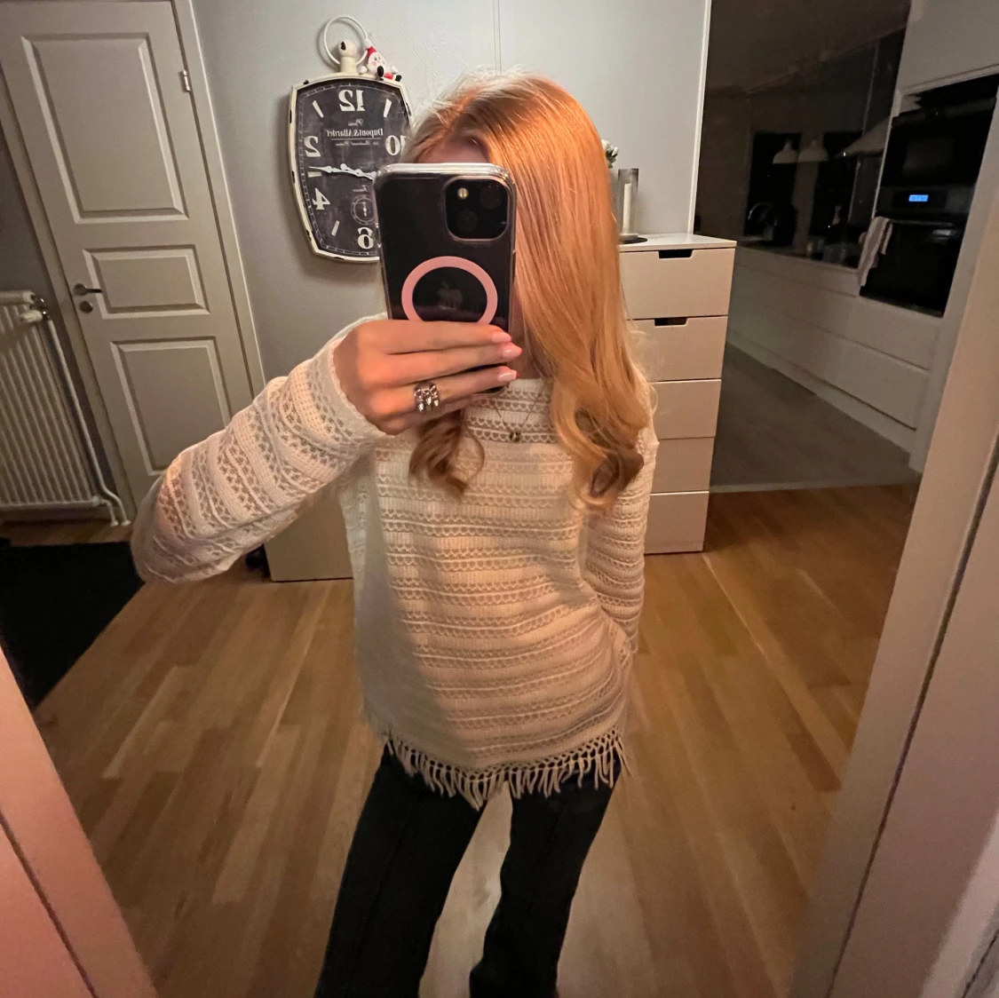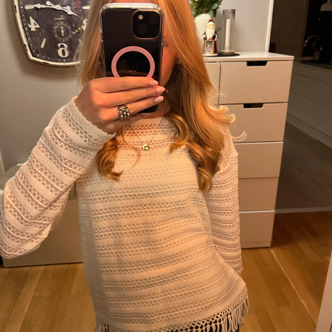 Säljer denna mönstrade tröja, pga att den inte kommer till användning,dock ganska genomskinlig så jätte fin till ett linne under som jag har på bilden.❣️skriv om frågor osv!