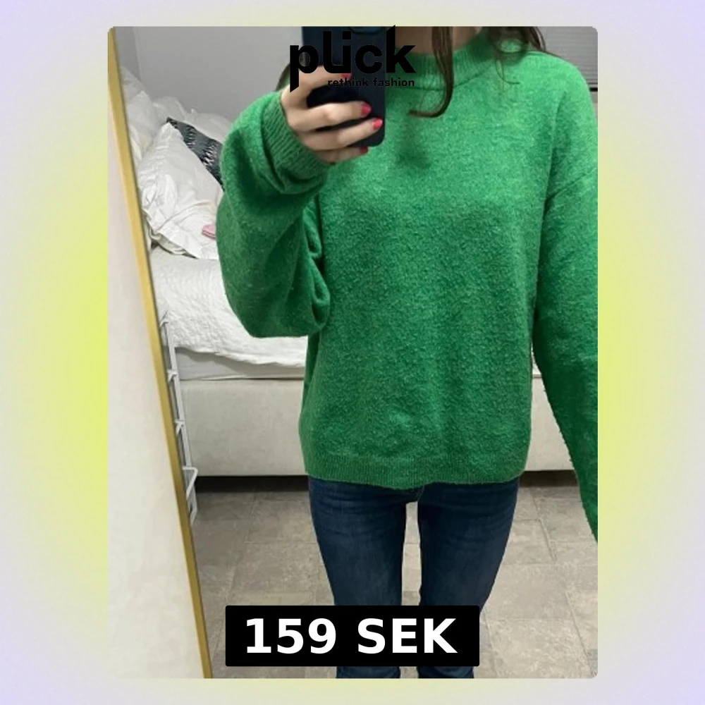 Säljer en grön stickad tröja från H&M i storlek XS. Tröjan har en avslappnad passform, rund halsringning och ribbade muddar vid ärmslut och nederkant. Perfekt för lager på lager och enkel att styla med jeans eller kjol.
