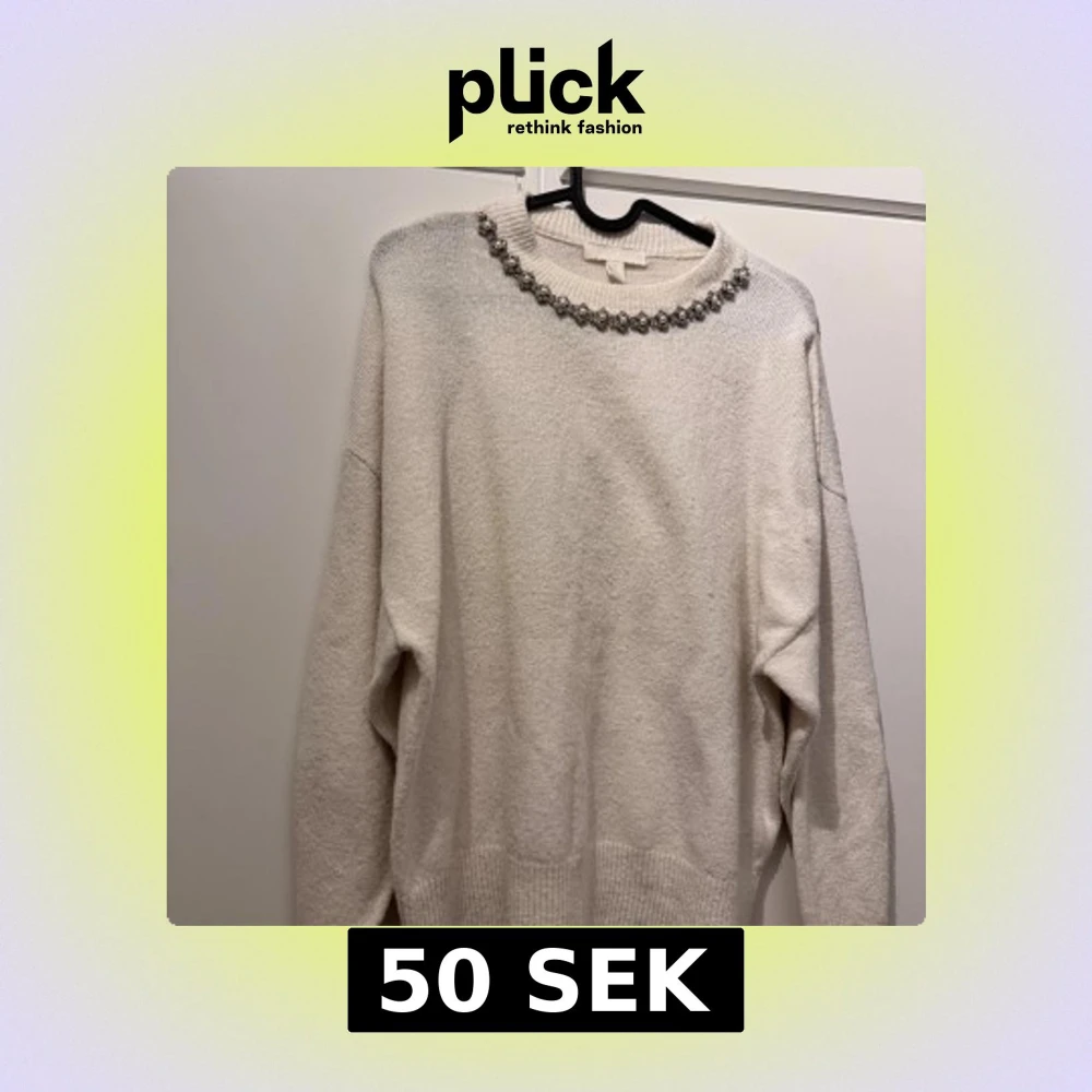 Superfin vit stickad tröja från H&M i storlek XS. Tröjan har långa ärmar, ribbade muddar och en rund halsringning dekorerad med pärlor och glittriga stenar som ger en lyxig känsla. Perfekt för dig som vill sticka ut lite extra.