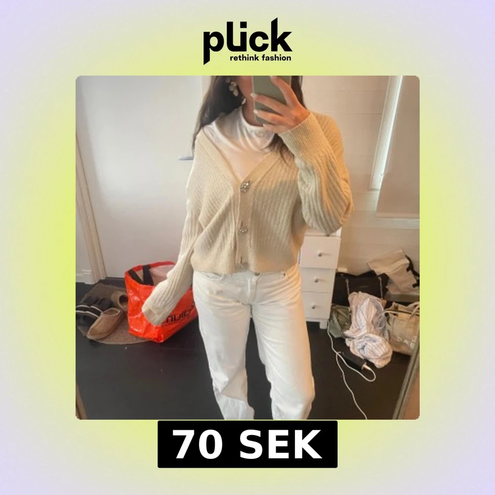 Superfin beige ribbstickad kofta från H&M med v-ringning och två glittriga pärlknappar framtill. Modellen är croppad och har långa ärmar. Perfekt att slänga över en t-shirt för en chill look.