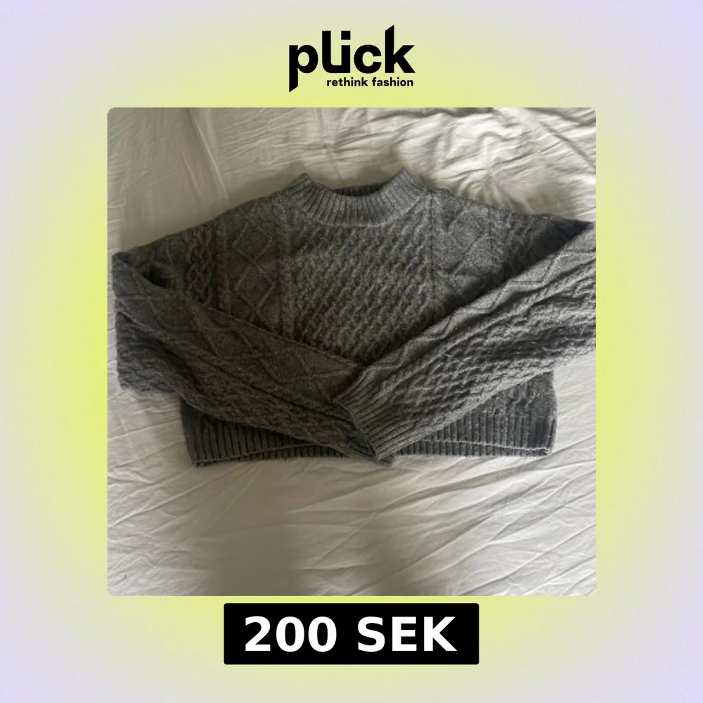 Mysig grå stickad tröja från H&M i storlek XS. Tröjan har ett klassiskt kabelstickat mönster, ribbade muddar och hög hals. Perfekt för kyliga dagar och enkel att matcha med jeans eller kjol.
