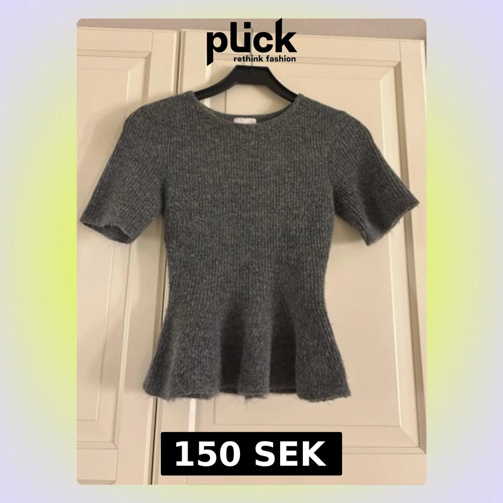 Säljer en grå stickad topp från H&M med korta ärmar och figurnära passform. Toppen har en lätt utsvängd nederkant och rund halsringning. Perfekt för dig som gillar en enkel men snygg stil.
