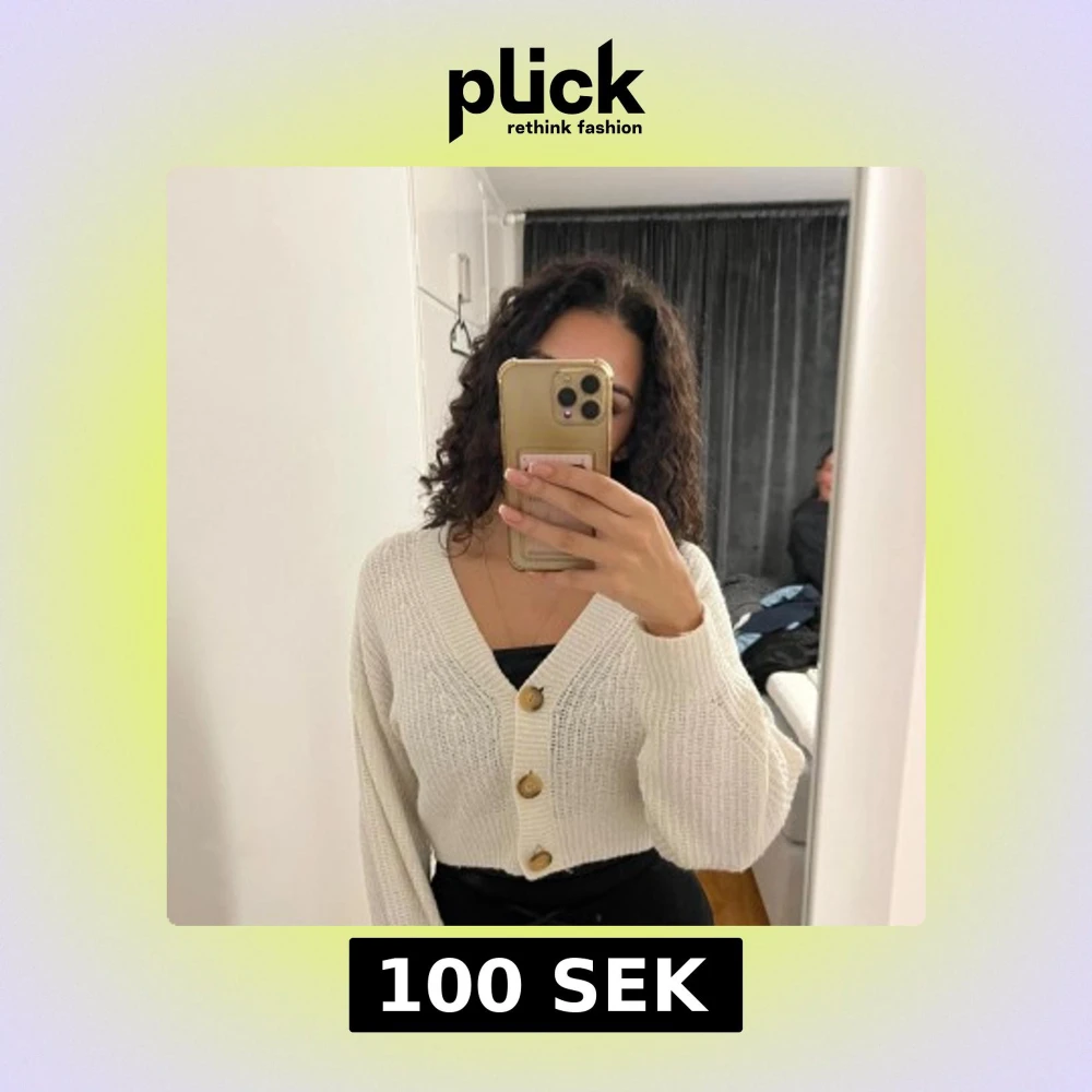 Superfin vit stickad kofta från Gina Tricot med croppad passform och stora träknappar framtill. Koftan har v-ringning, långa ärmar och är perfekt att slänga över ett linne eller t-shirt. Mjuk och skön, passar till allt!