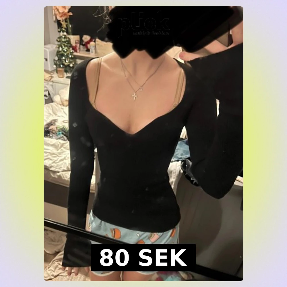Säljer en svart ribbad långärmad topp från H&M i storlek XS. Toppen har en djup v-ringning och sitter tight mot kroppen. Materialet är mjukt och stretchigt, perfekt för dig som gillar en slim och stilren look. Passar dig som vill ha en enkel men snygg topp med lite edge.