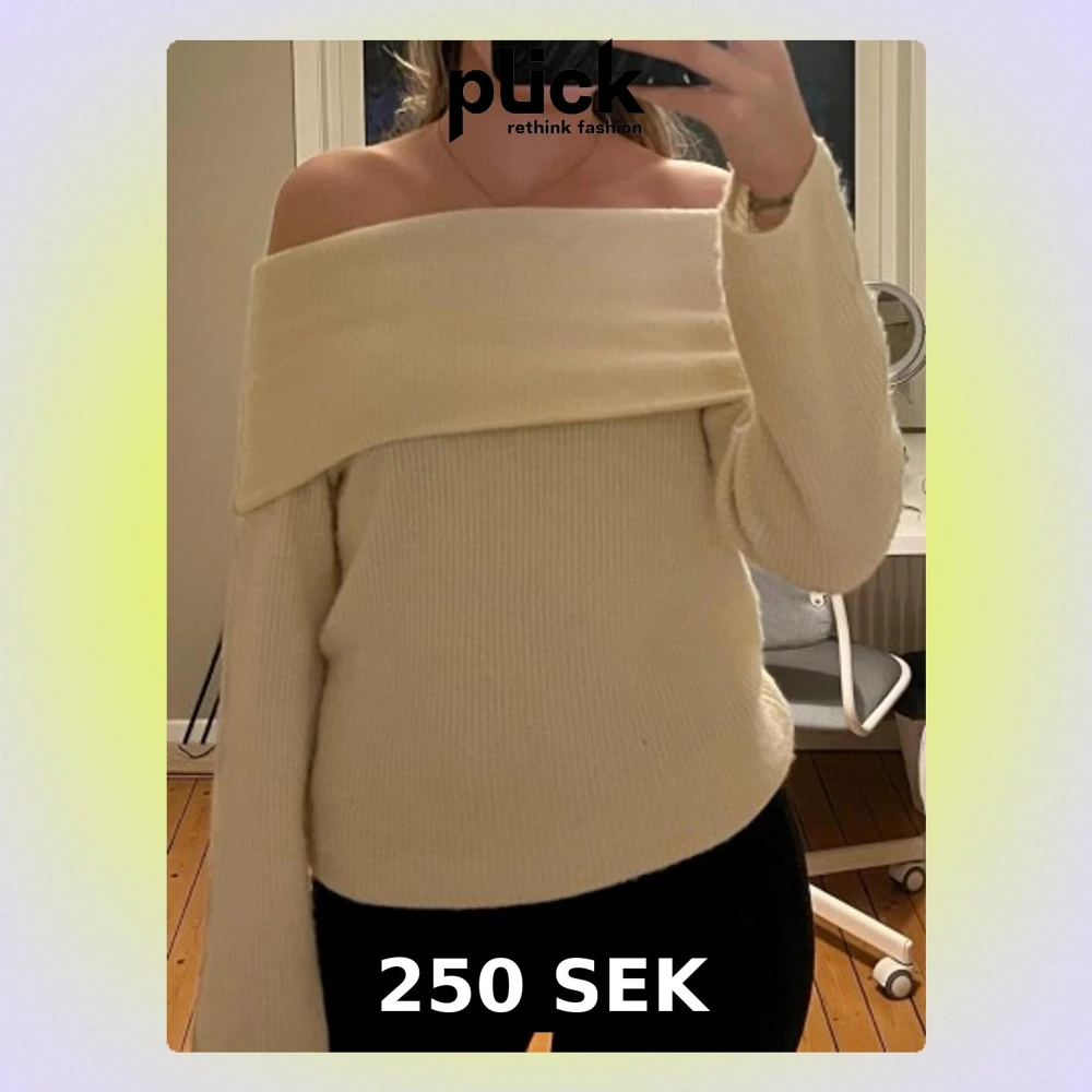 Cremevit stickad tröja med off shoulder-design och bred krage. Tröjan har långa ärmar och är ribbstickad för en snygg och bekväm passform. Perfekt för dig som vill ha en trendig och mysig look🤍Skulle säga att den passar xs-s