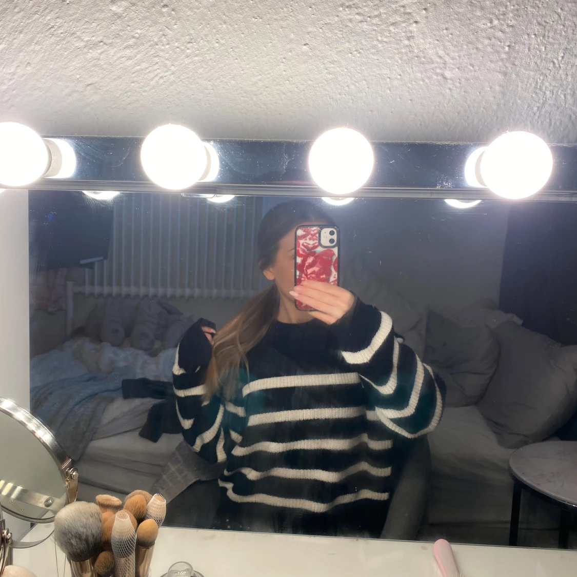 Mysig svart och vit randig tröja med lång ärm. Perfekt för kyligare dagar och ger en avslappnad stil. Tröjan har en loose passform som gör den bekväm att bära. Aldrig använd!