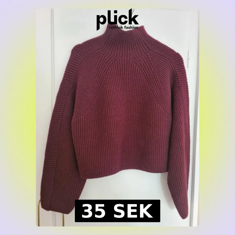 Vinröd ribbstickad tröja med hög krage och långa ärmar. Tröjan har en boxy passform och stickade detaljer.