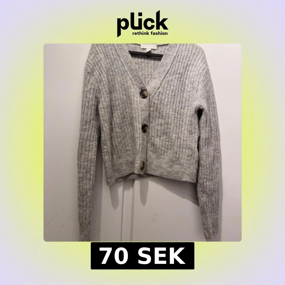 Mysig grå ribbstickad kofta från H&M med v-ringning och stora knappar framtill. Koftan har lång ärm och en något croppad passform, perfekt att slänga över en t-shirt eller linne. Enkel och stilren design som funkar till det mesta.