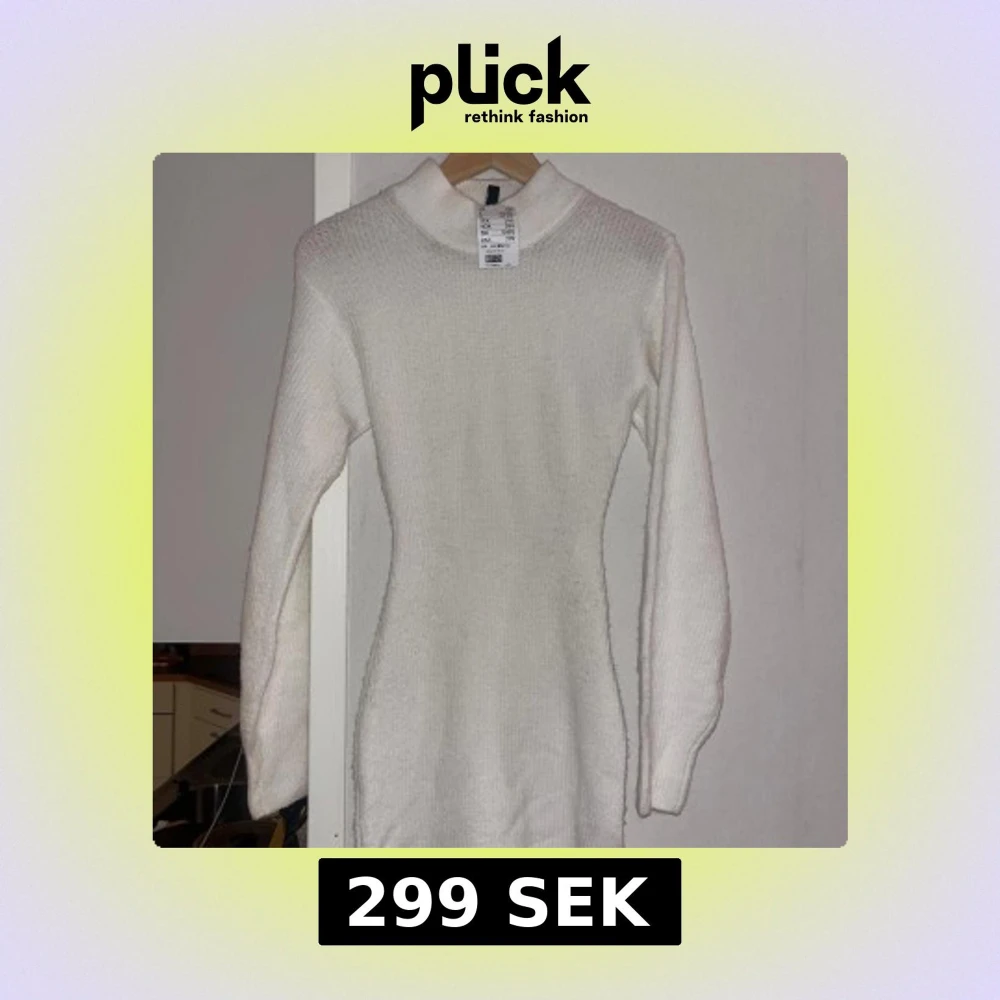 Supermysigs vit stickad klänning från H&M med lång ärm och hög krage. Den har en liten slits. Klänningen är figurnära och har en enkel, stilren design som passar perfekt till kyligare dagar. Perfekt att styla med boots eller sneakers.