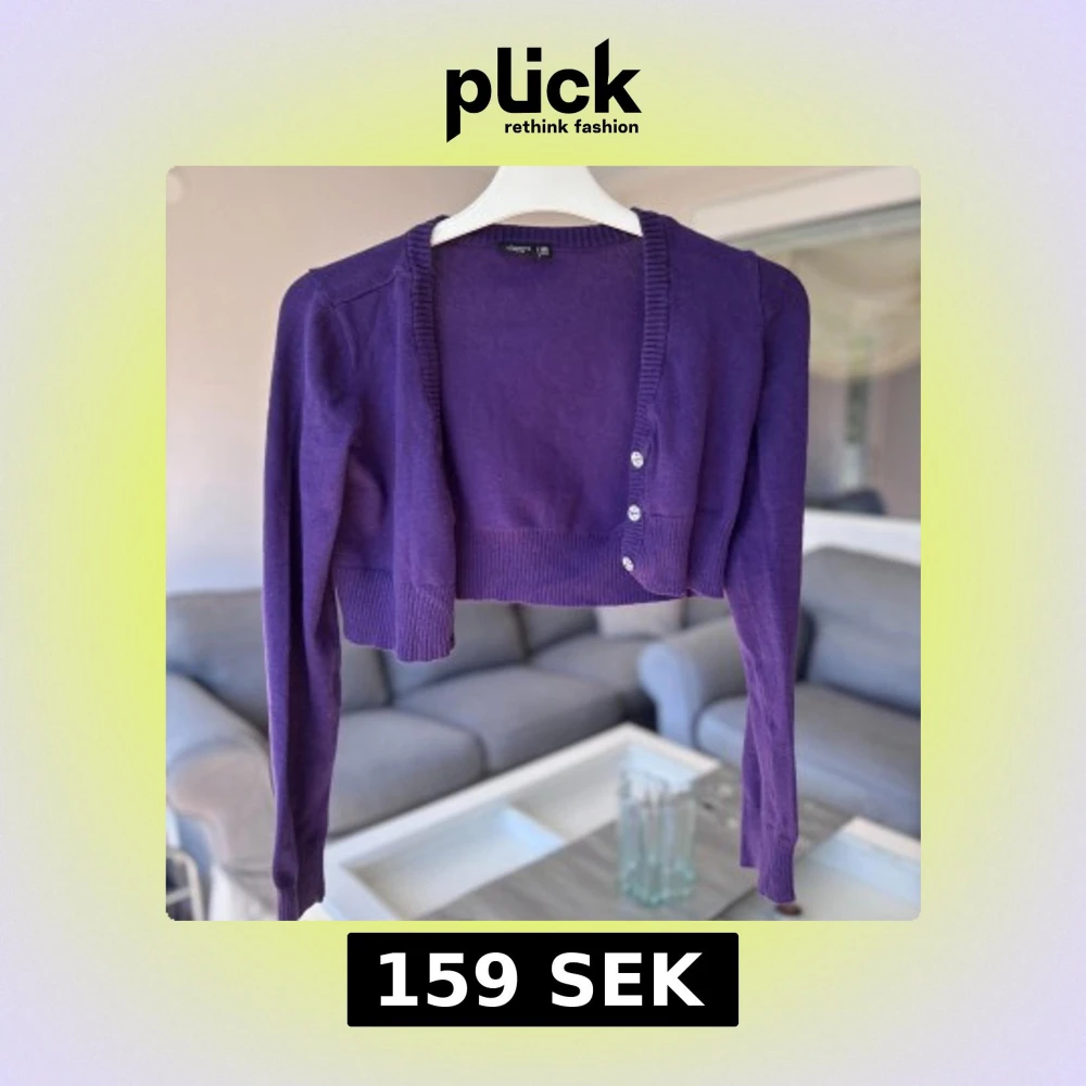 Superfin lila croppad kofta från H&M med långa ärmar och tre glittriga knappar framtill. Koftan har ribbade muddar och en mjuk, stickad känsla. Perfekt att slänga över en topp för en cool och färgstark look.