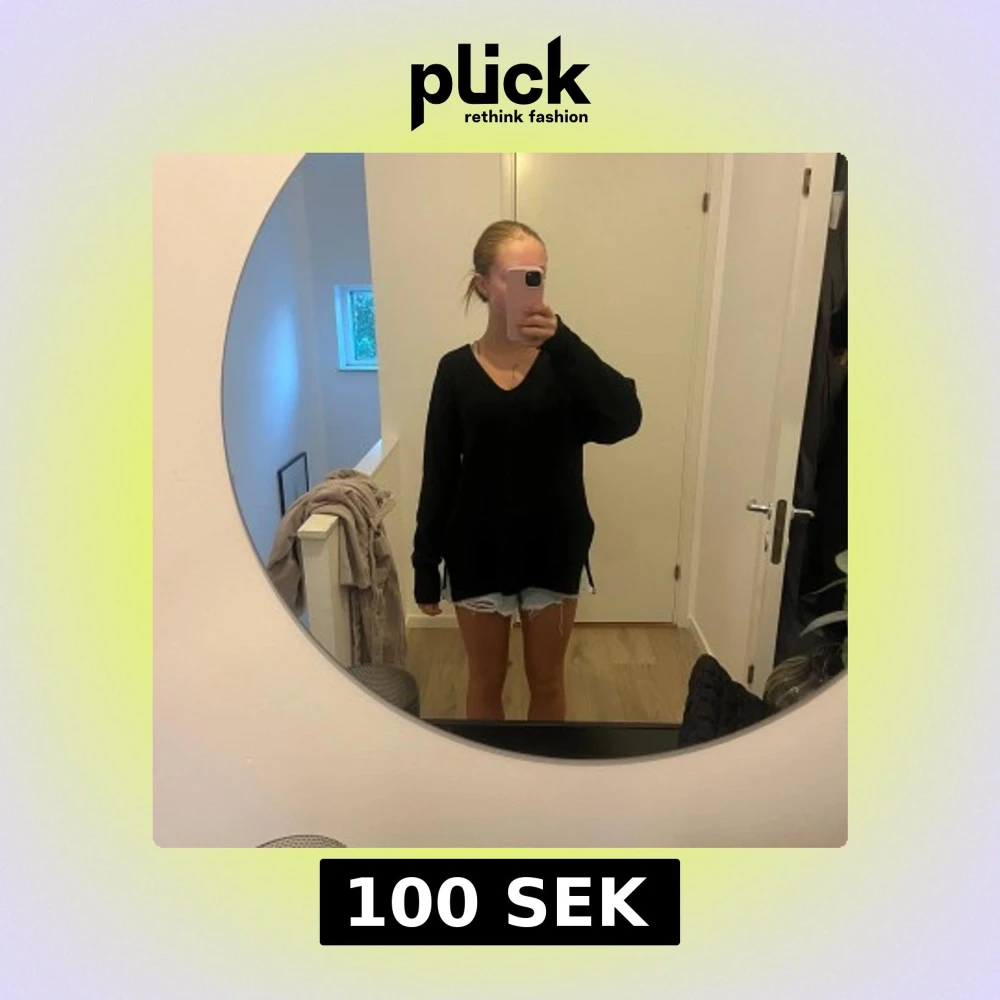 Svart stickad tröja från H&M i oversized modell med v-ringning och långa ärmar. Tröjan har slitsar i sidorna och är perfekt för lager-på-lager. Enkel och stilren design som funkar till allt. Strl Xs 💗