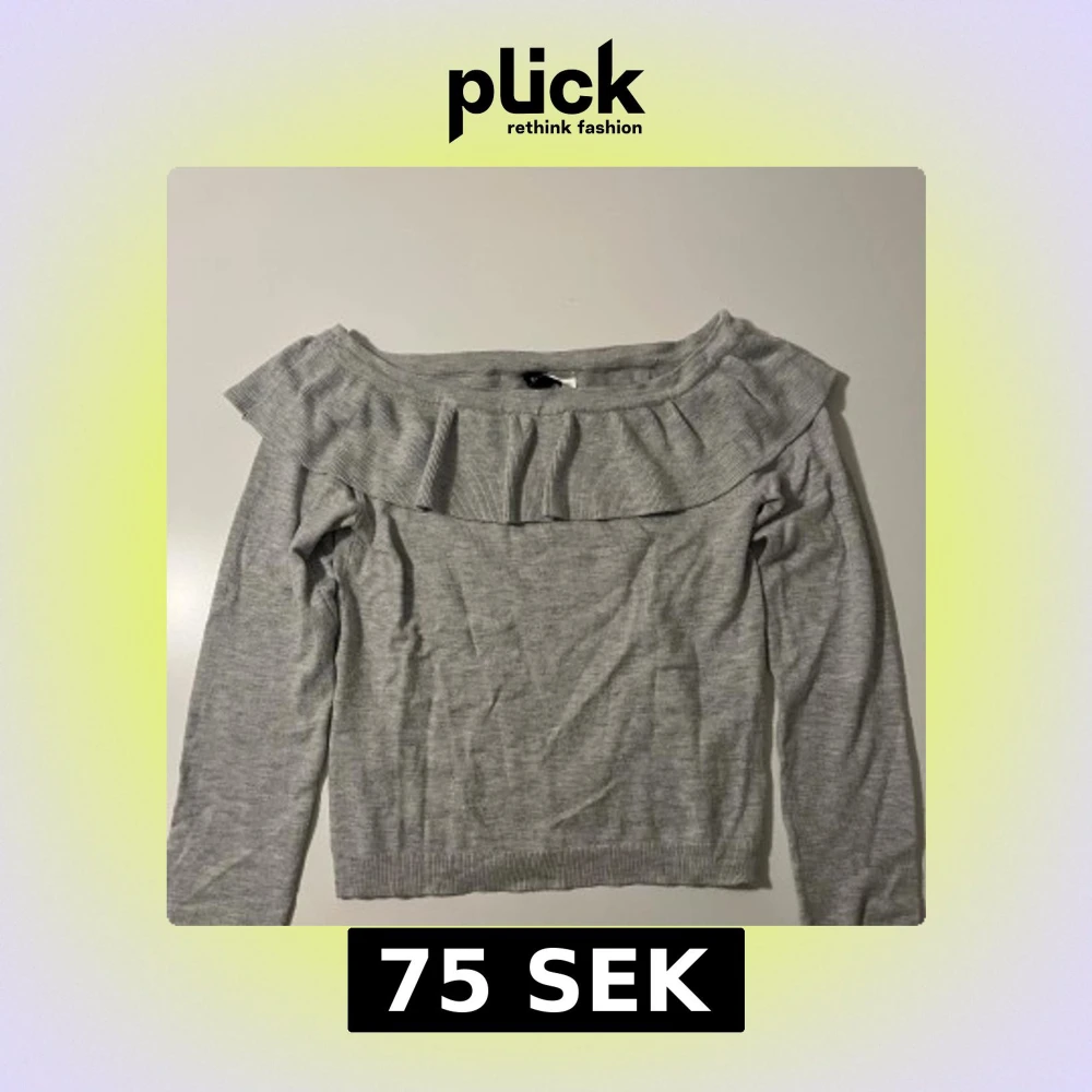 Söt ljusgrå offshoulder tröja från hm i storlek XS. Tröjan har en bred volang längs halsringningen och är långärmad.