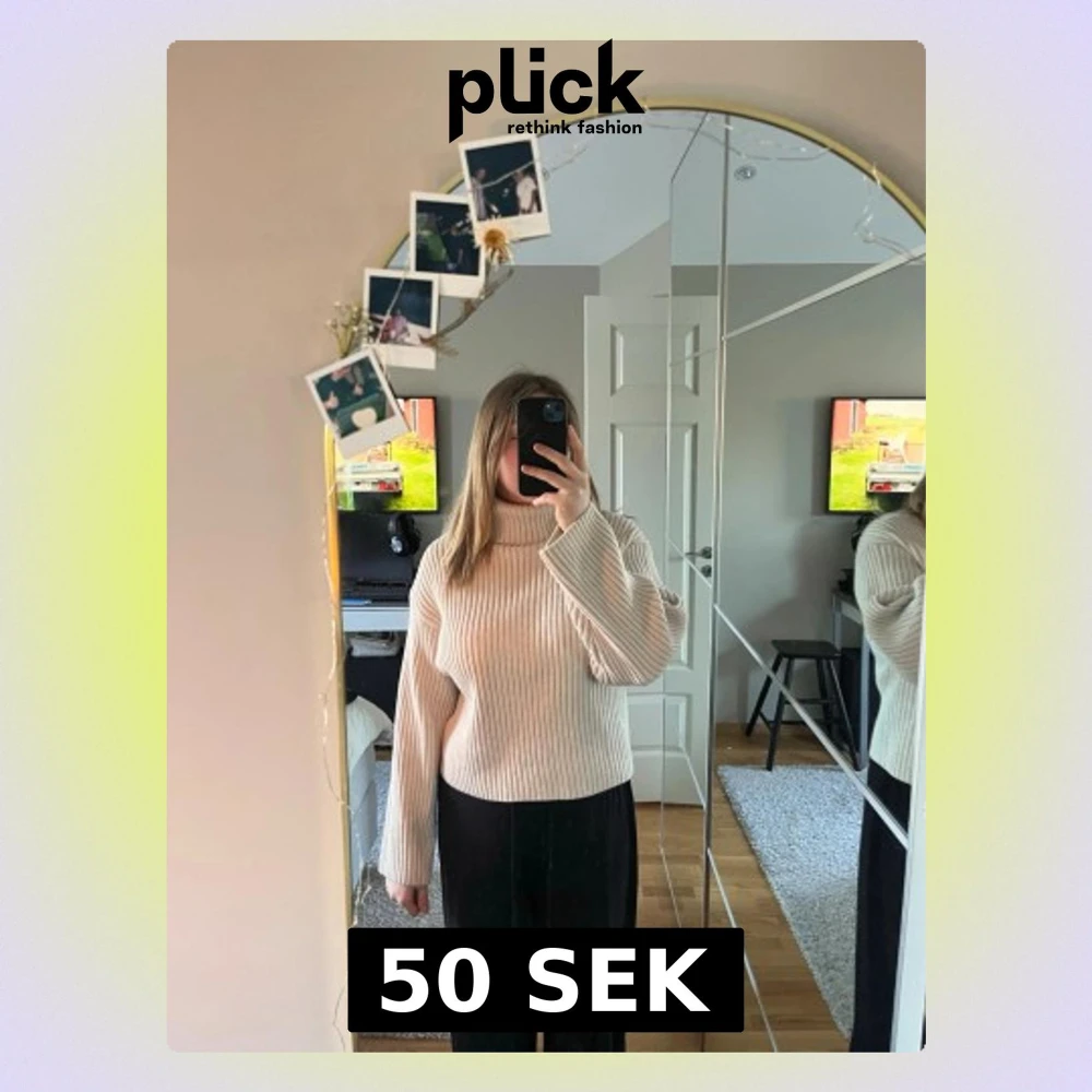 Säljer en vit ribbstickad tröja med hög krage och långa ärmar. Tröjan har en avslappnad passform och är perfekt för kyligare dagar. Materialet ser mjukt och tjockt ut, vilket gör den extra mysig.