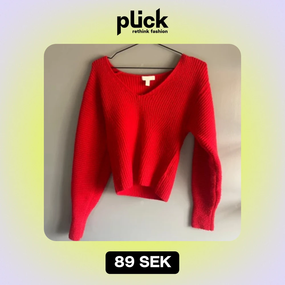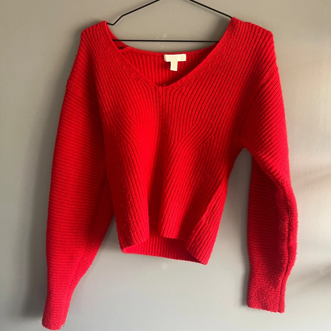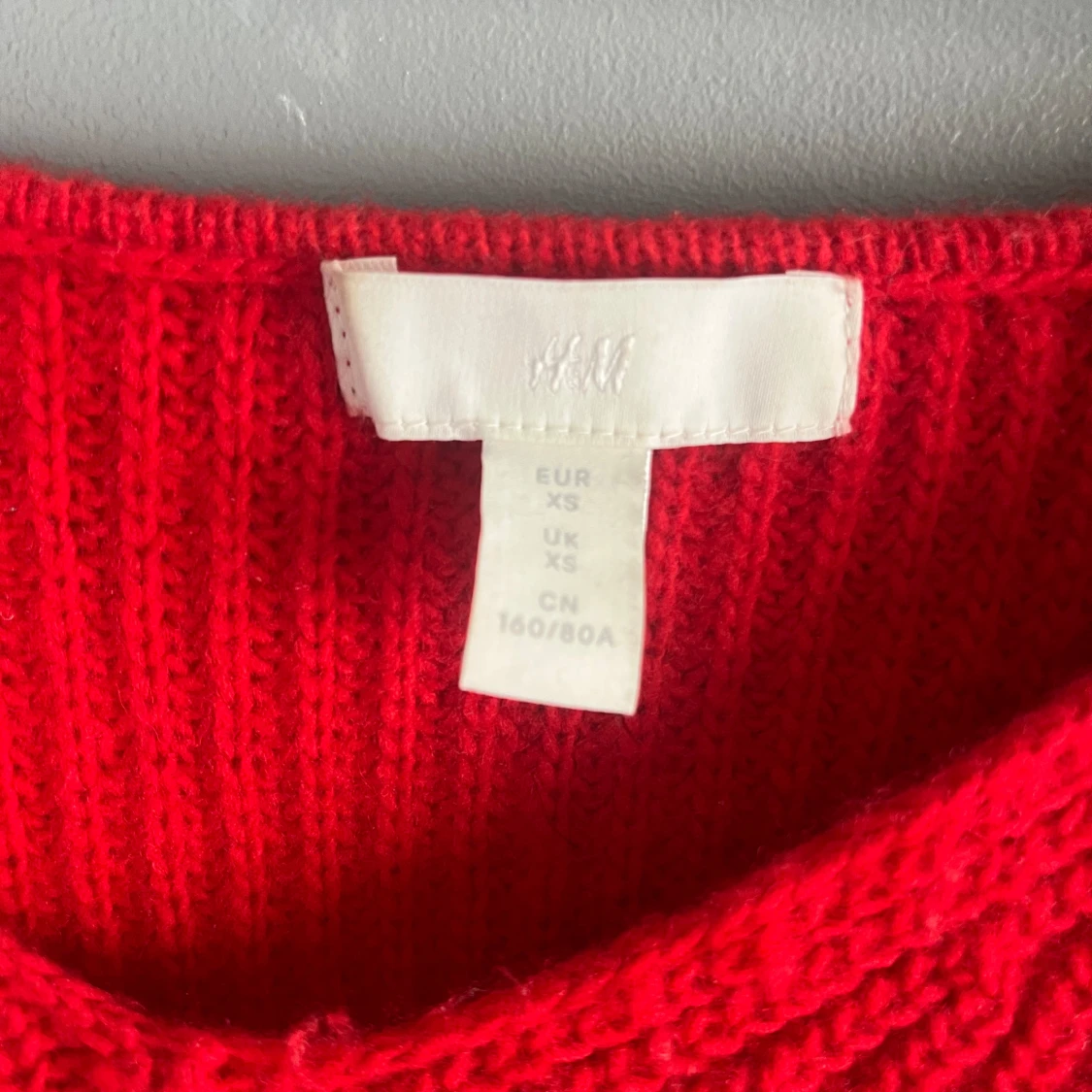 Röd ribbstickad tröja med v ringning, från H&M, i storlek xs. Endast använd 1 gång. Fin speciellt inför julen, då jag använde den. Skriv för fler frågor eller diskutera pris m.m.💞