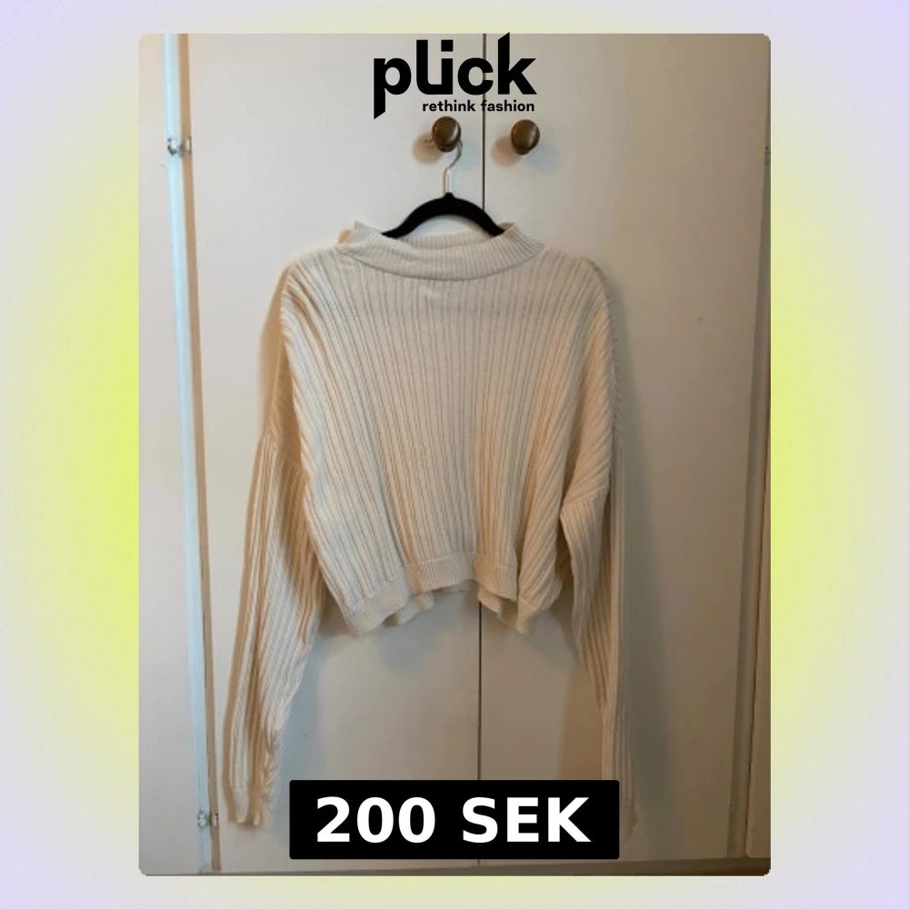 Säljer en vit ribbstickad tröja med croppad passform och långa ärmar.