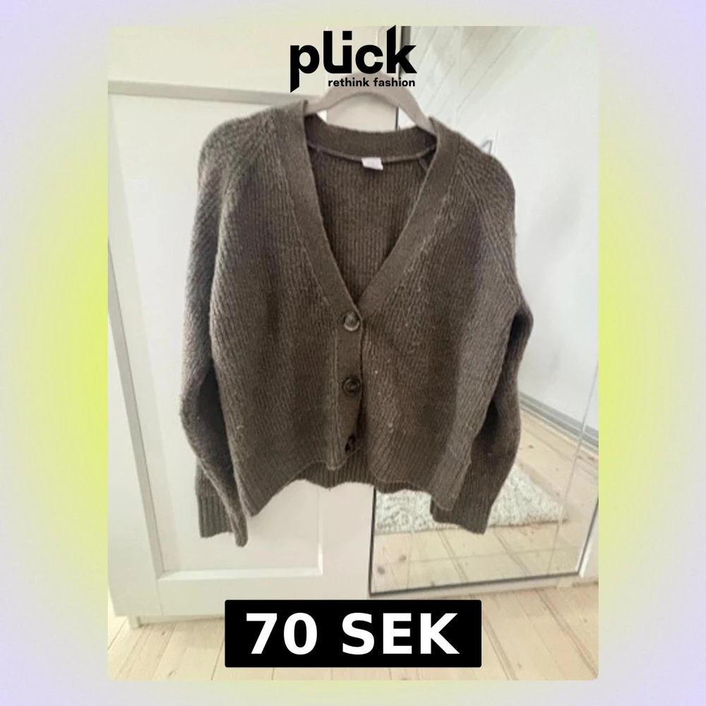 Mysig brun stickad kofta från Lindex med tre stora knappar framtill och v-ringad hals. Koftan har långärmade ärmar och ribbade muddar vid ärmslut och nederkant. Perfekt för att hålla sig varm under kyliga dagar.