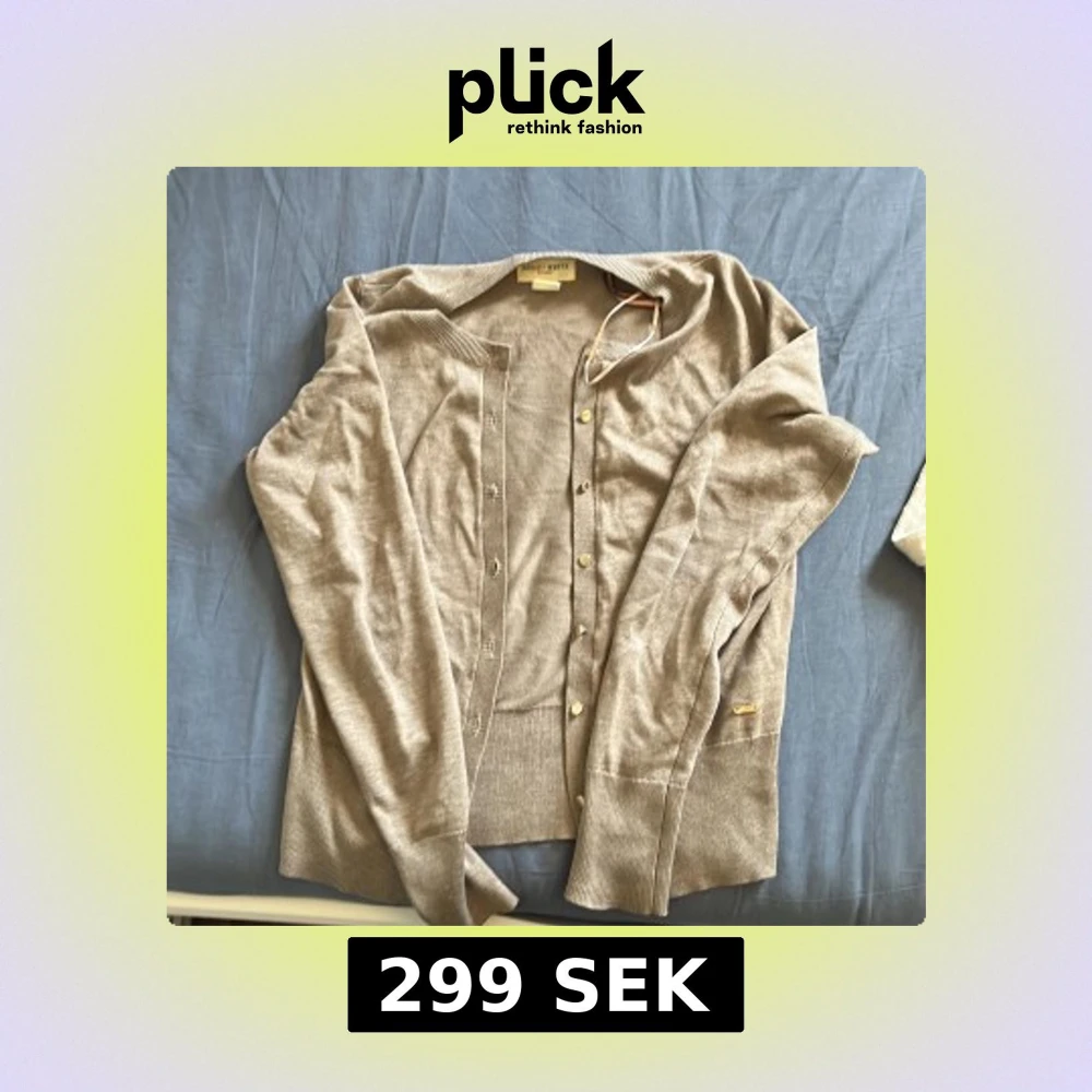 Snygg beige kofta från Holly & White by Lindex i storlek XS. Den har rund hals, långa ärmar och guldfärgade knappar framtill. Materialet är mjukt och stickat, perfekt för lager-på-lager. Diskret metallmärke vid nederkanten ger en extra touch.