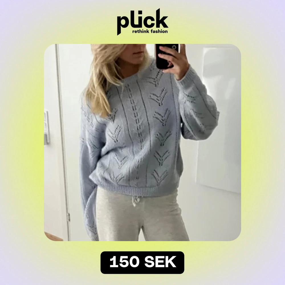 Superfin babyblå stickad tröja. Den har fina ”virkade” detaljer.