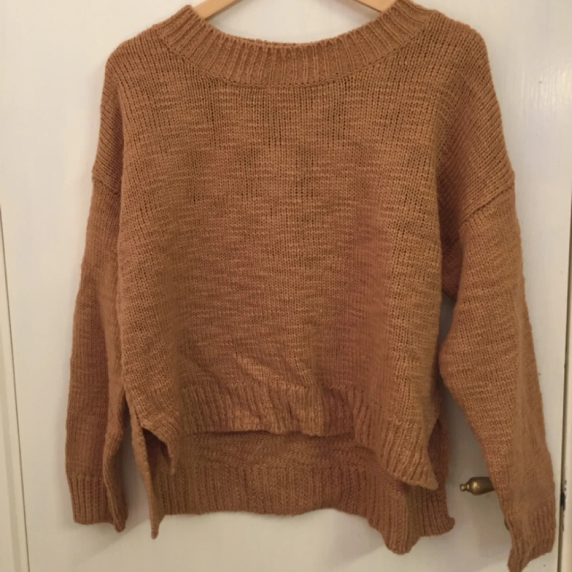 Stor, mysig stickad tröja. Den är längre bak än fram