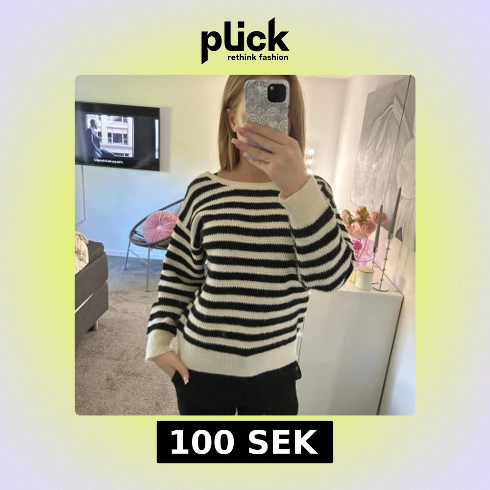 Säljer en svartvit stickad tröja med breda ränder och snygg rosettdetalj i ryggen. Tröjan har lång ärm, öppen rygg och är lite loose i passformen. Perfekt för dig som gillar en chill men ändå unik look.