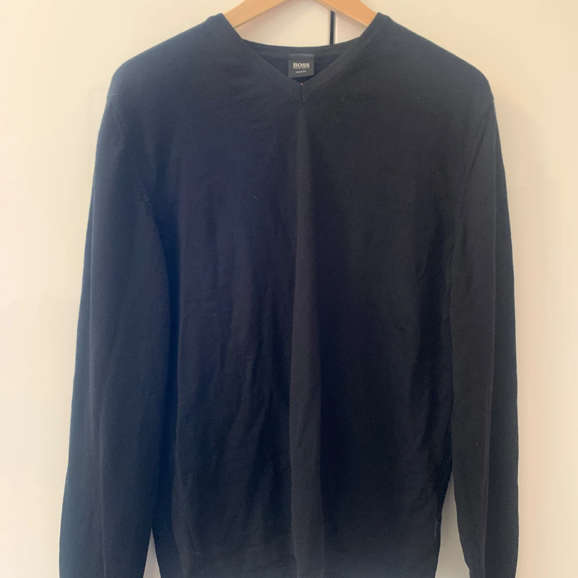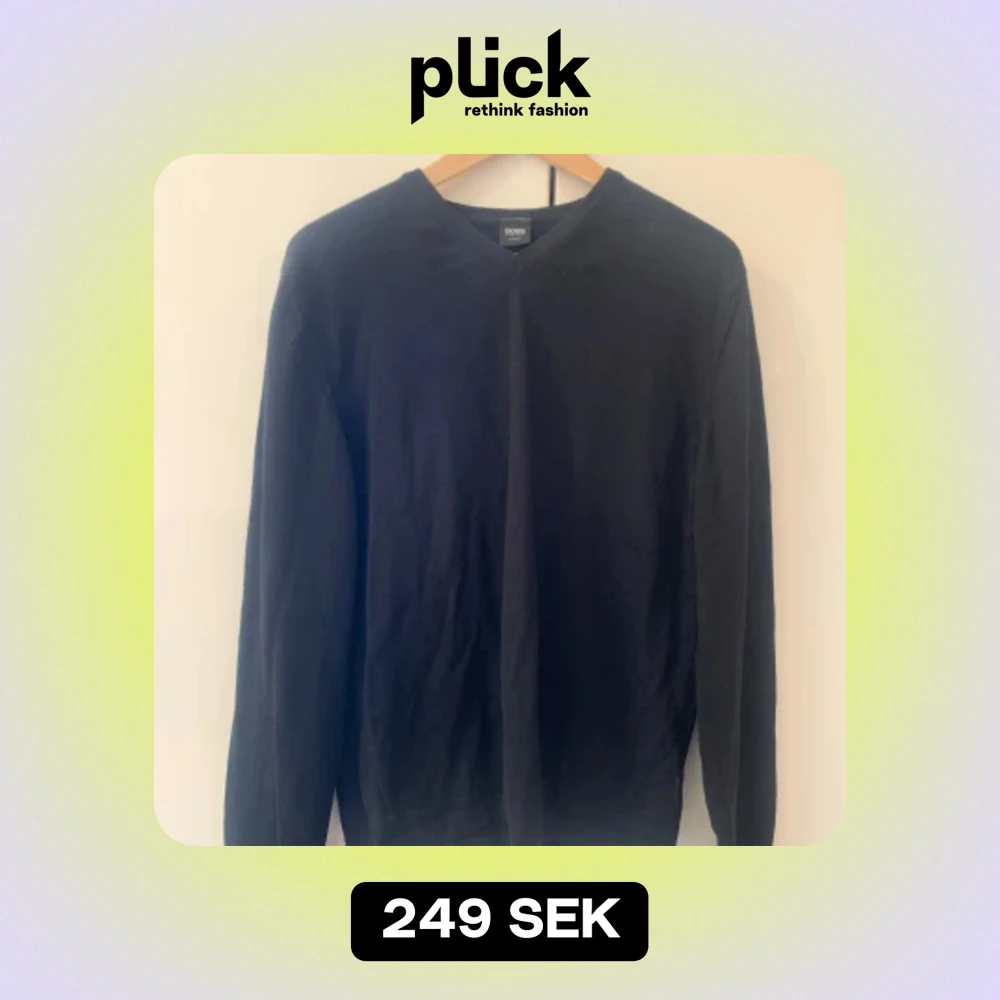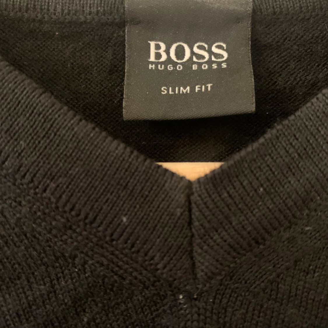 En snygg svart v-ringad stickad tröja 100% ull från Hugo Boss. Står stl L men jag tycker att den är mer en S-M. Kan gå ner i pris vid snabb affär, hör av er om det är något ni undrar över.