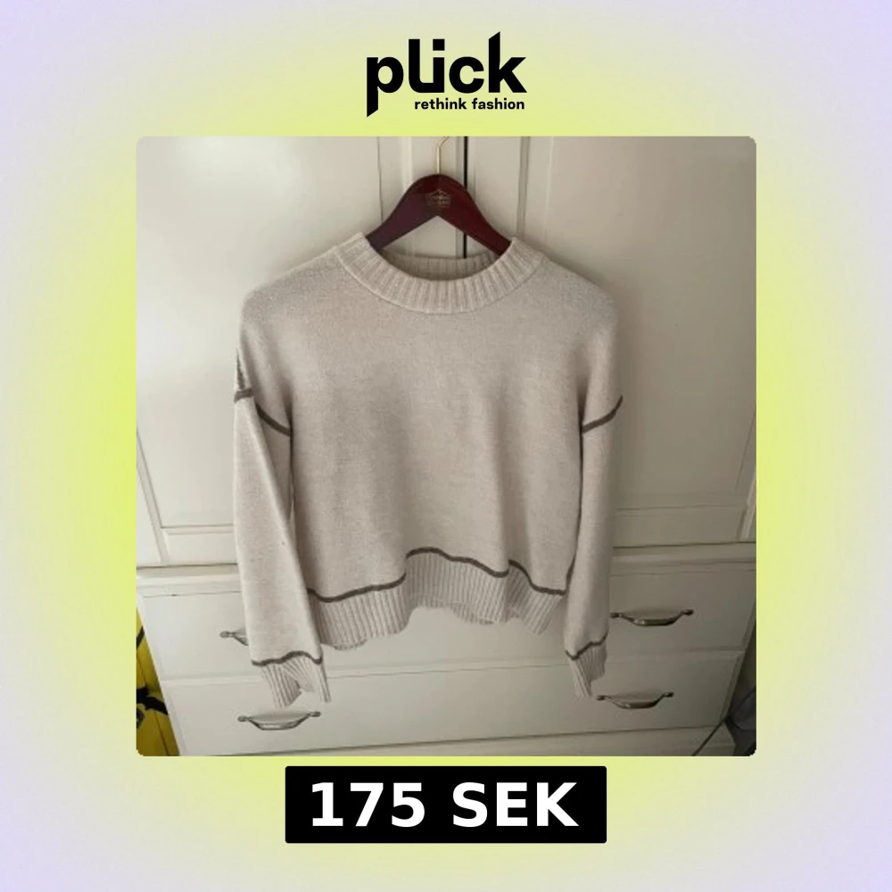 Beige stickad tröja med ribbad krage, ärmslut och nederkant. Tröjan har mörkare kontrastsömmar längs ärmar och fåll, samt en avslappnad passform och långa ärmar. Köpt på Indiska!❣️