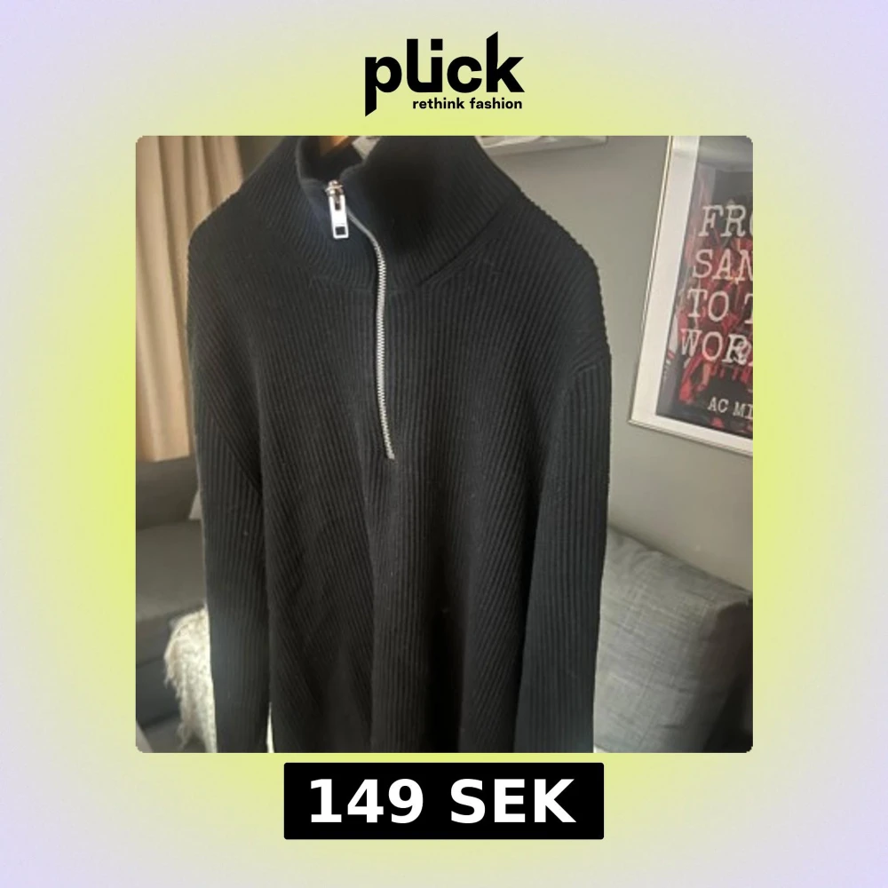 Säljer en svart stickad tröja från Jack & Jones med hög krage och dragkedja framtill. Tröjan har ribbad struktur och lång ärm, perfekt för kyligare dagar. Enkel och stilren design som passar till det mesta.
