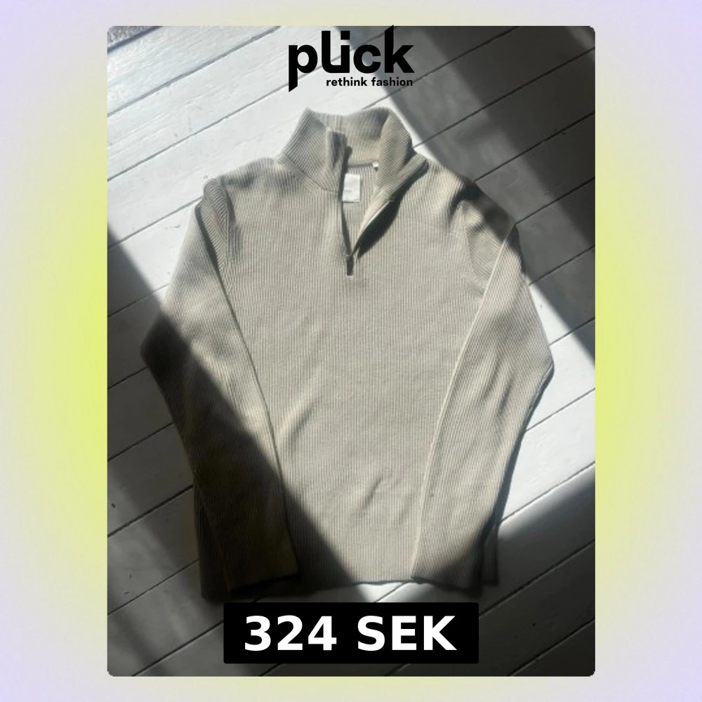Snygg beige stickad tröja med ribbad struktur och halvzip i halsen. Tröjan har lång ärm och hög krage, perfekt för lager på lager. Enkel och stilren design som passar till det mesta.