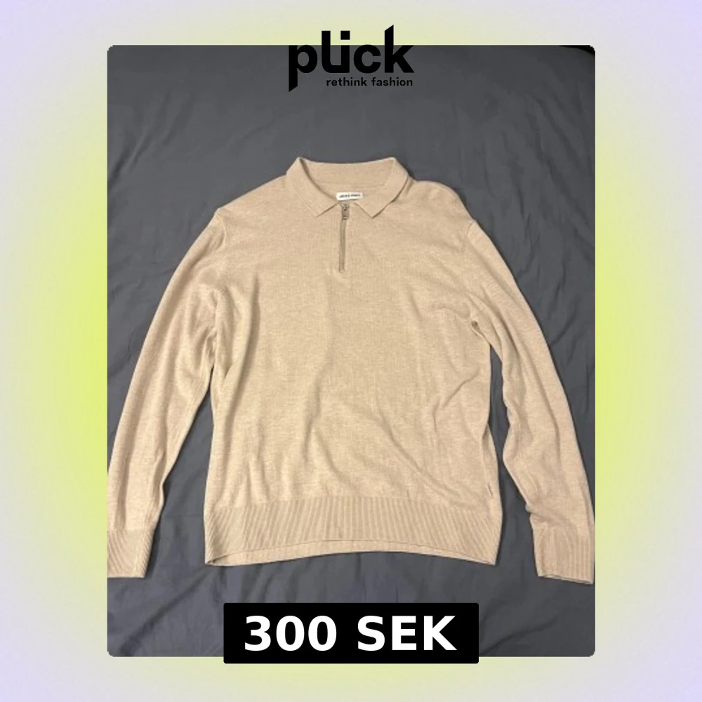 Snygg beige tröja från Jack & Jones i storlek M. Tröjan har krage och en halv dragkedja framtill, vilket ger en clean och stilren look. Tillverkad i mjukt material med ribbade muddar vid ärmslut och nederkant. Perfekt för lager-på-lager under höst och vår.
