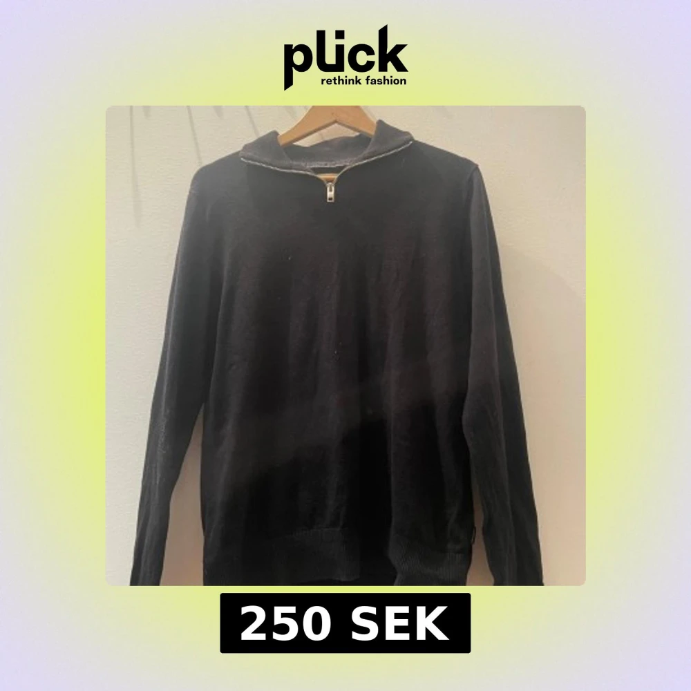 Svart stickad tröja med ribbade muddar och en snygg half zip-dragkedja vid kragen. Perfekt för lager-på-lager och funkar lika bra till jeans som till dressade byxor. Långärmad och enkel att matcha med det mesta.