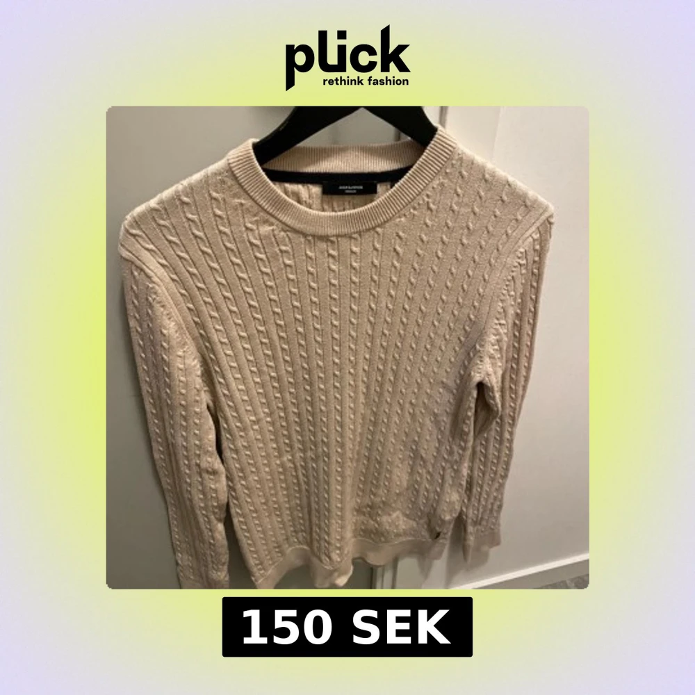 Säljer en stilren beige stickad tröja från Jack & Jones. Tröjan har ett klassiskt flätmönster och rund halsringning.
