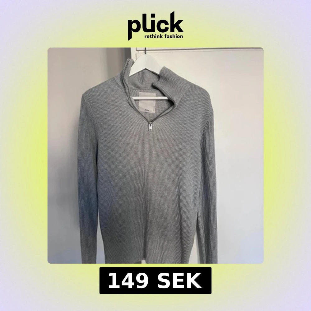 Säljer en stilren grå ribbstickad tröja från Jack & Jones med half zip-dragkedja i halsen. Tröjan har lång ärm och hög krage, perfekt för lager-på-lager. Enkel att matcha och riktigt skön att bära.