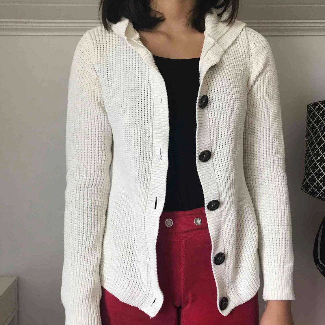 En vit stickad kofta från JC som har knappar och en luva. Kostar 120kr inklusive frakt.