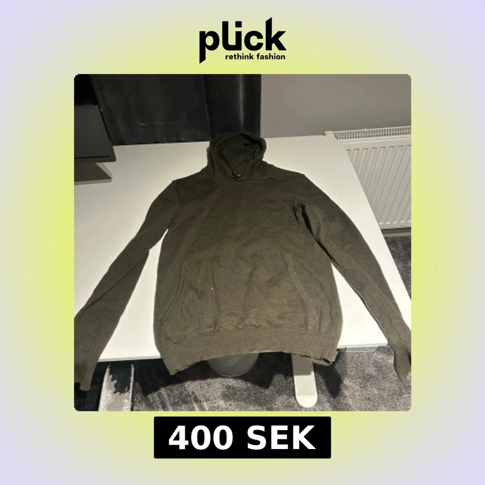 En mörkgrön merinoull hoodie som är storlek L men morsan krympte den i tvätten så den sitter som XS.