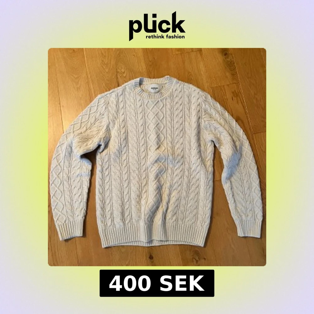 Säljer en ljus, kabelstickad tröja från Dobber i storlek medium. Tröjan har klassiskt flätmönster, rund halsringning och ribbade muddar vid ärmslut och nederkant. Perfekt för kyliga dagar och enkel att matcha med jeans eller chinos.