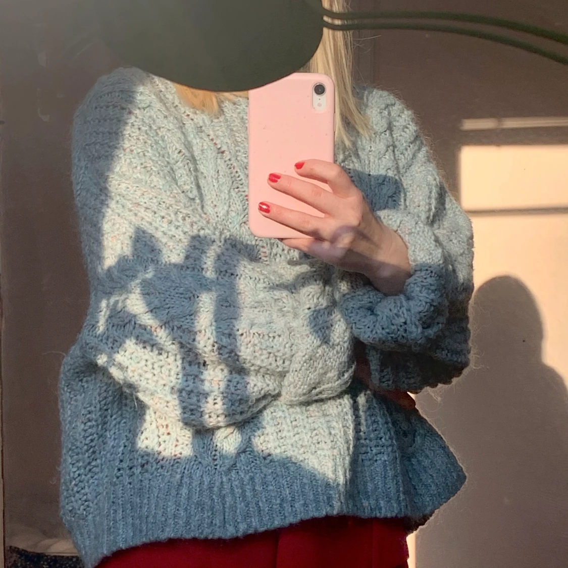Världens mysigaste stickade tröja. Omärkt men uppskattar storleken till L. Har själv XS/S så den funkar absolut oversize också!