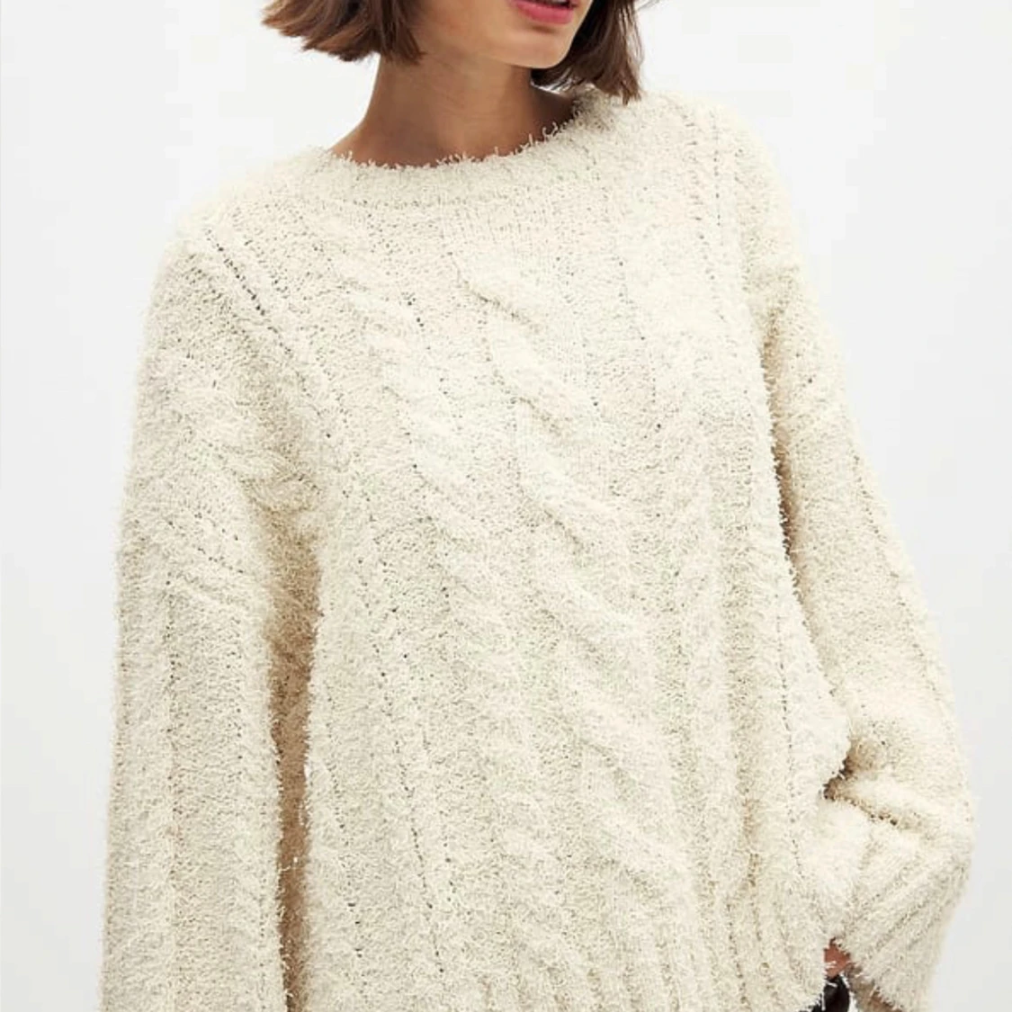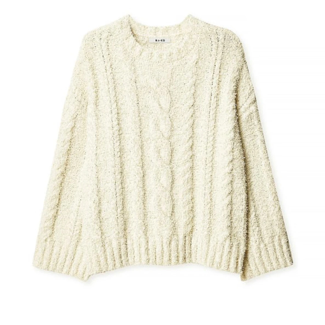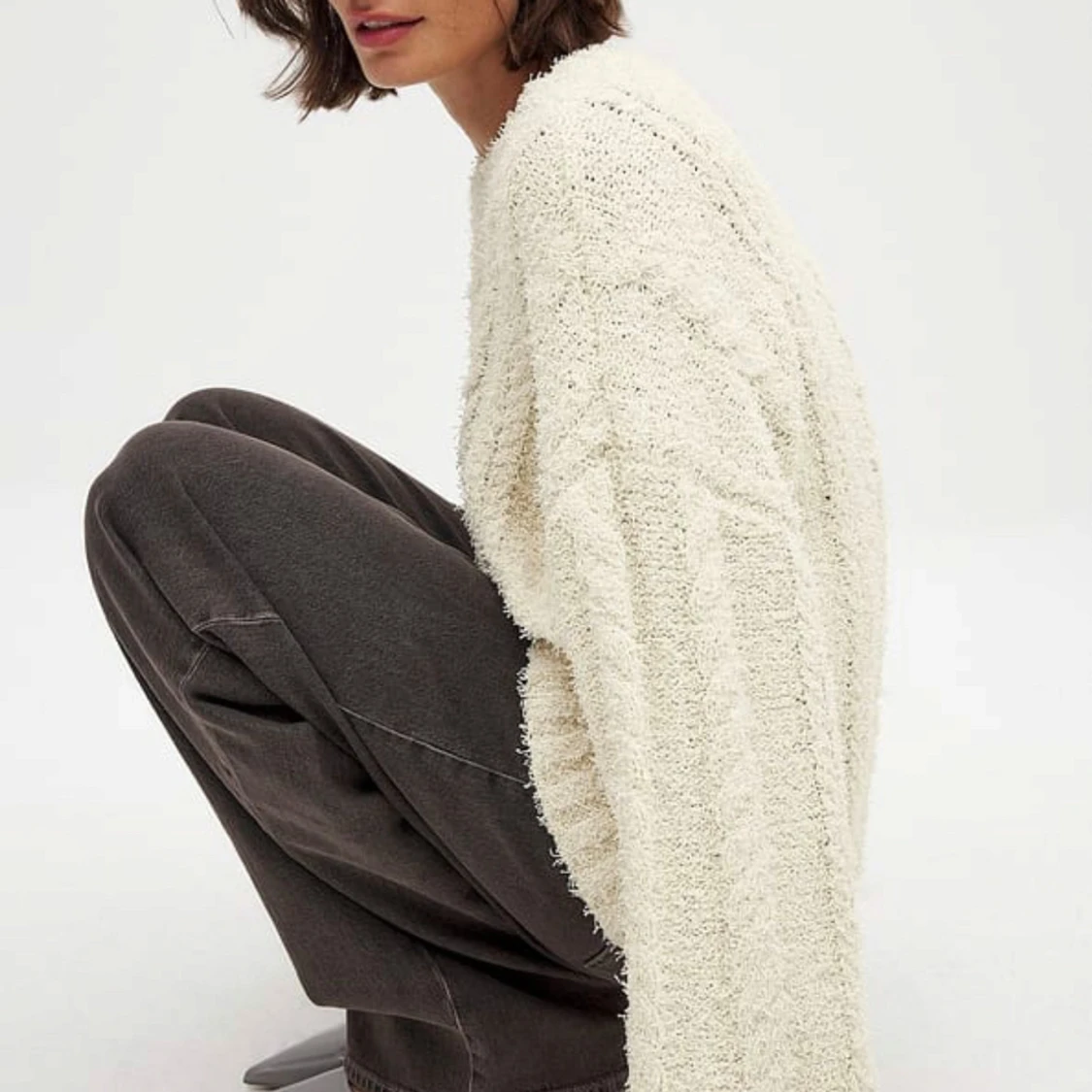 Supermysig krämvit stickad tröja från NA-KD med grov kabelstickning och lite oversized passform. Aldrig använd eller tvättad! Helt slutsåld just nu!