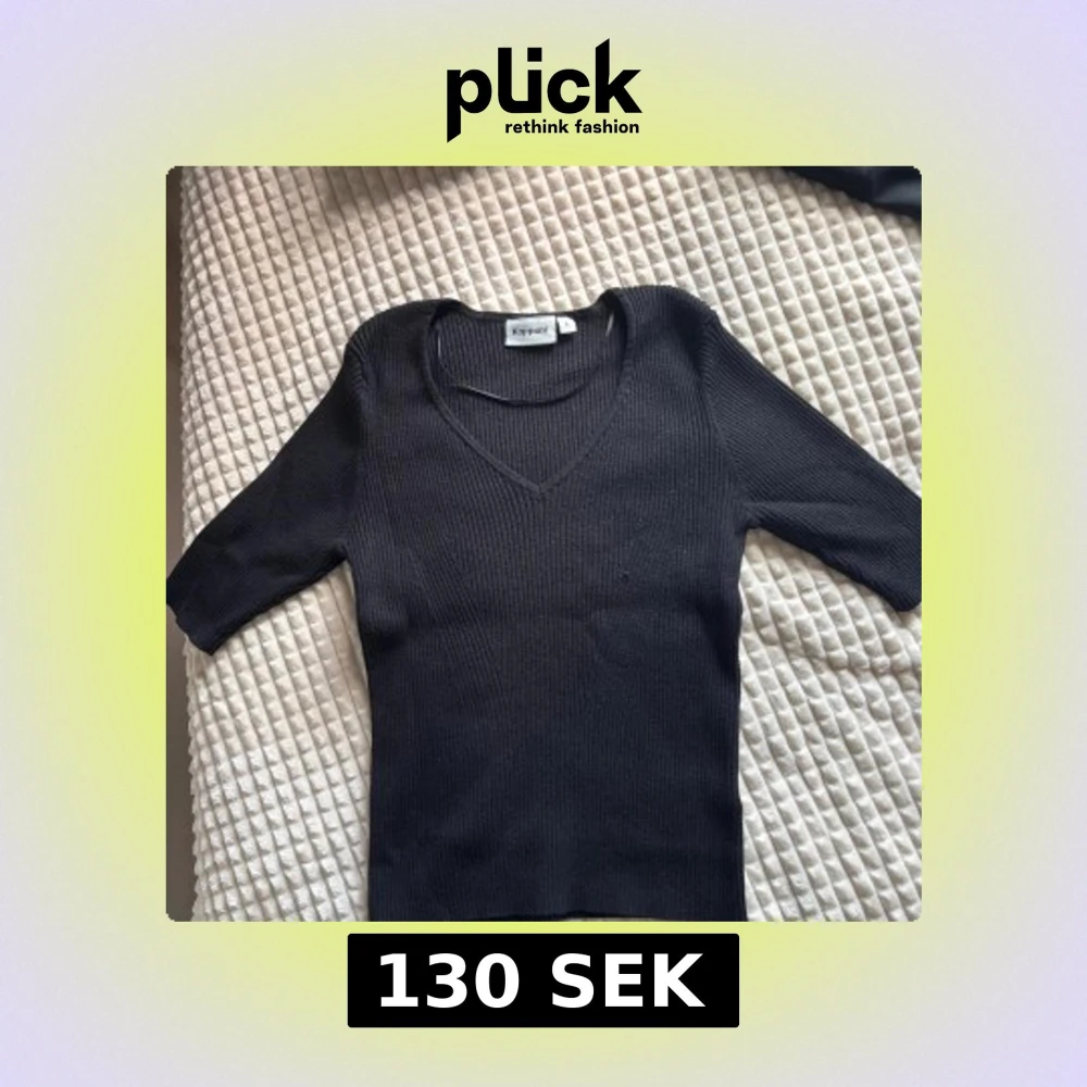 Svart ribbad tröja från Kappahl med v-ringning och trekvartsärm. Tröjan har en slim passform och är tillverkad i ett mjukt, stickat material som sitter snyggt på kroppen. Jag bär vanligtvis storlek xs/s men denna satt tajt också. Pris går att diskutera.