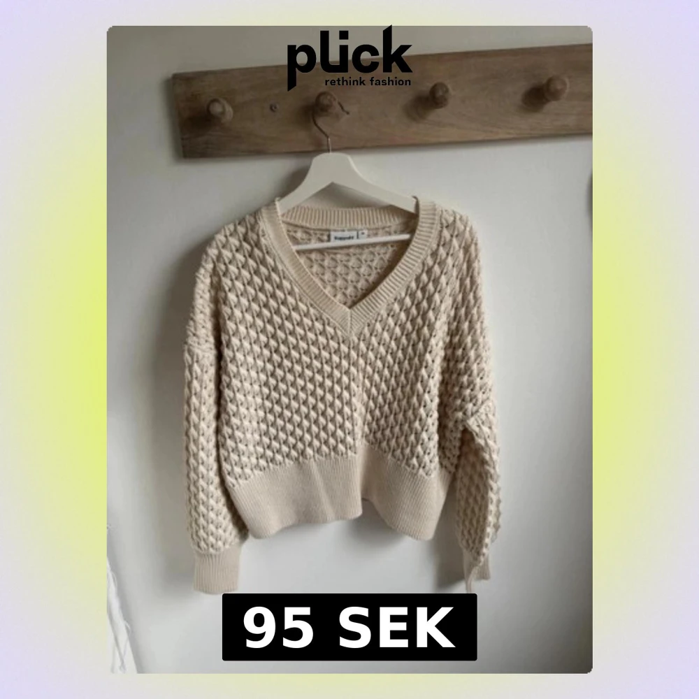 Säljer en beige stickad tröja från Kappahl med djup v-ringning och grovt strukturmönster. Tröjan har breda ribbade muddar vid ärmslut och nederkant samt en avslappnad passform. Perfekt för lager på lager och riktigt mysig.