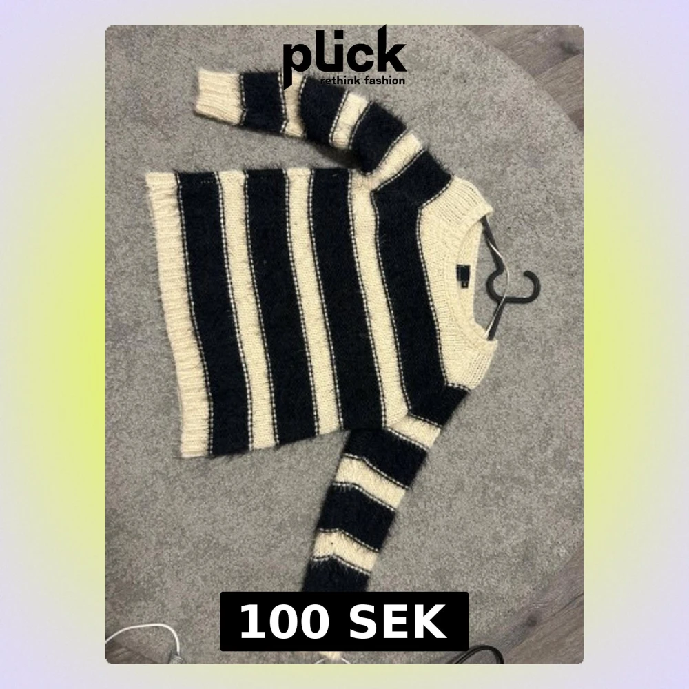 Mysig stickad tröja från KappAhl i storlek M. Tröjan har breda svarta och beige ränder, rund hals och långa ärmar. Den grova stickningen ger en chill vibe och passar perfekt när du vill vara både bekväm och snygg.