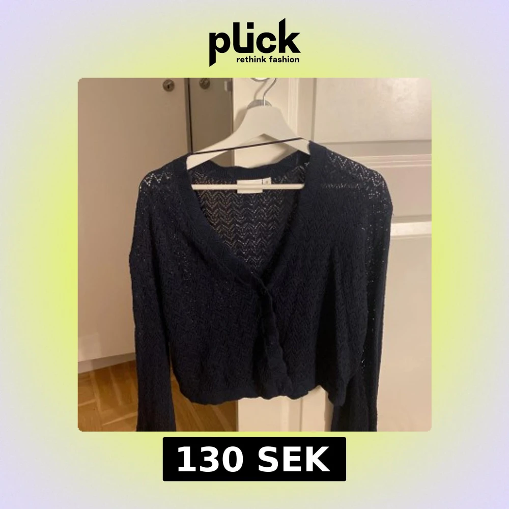 Säljer en mörkblå stickad kofta från Kappahl i storlek S. Koftan har ett snyggt hålmönster, v-ringning och knappar framtill. Perfekt att slänga över en topp för en chill look. Långärmad och i mjukt material.